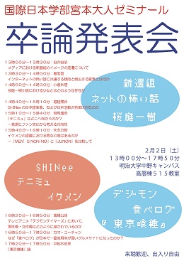 明治大学国際日本学部・宮本大人ゼミナールでは下記の要領で卒論発表会を行います。他学部の方、学外の方の来聴も歓迎します。入退室自由です。