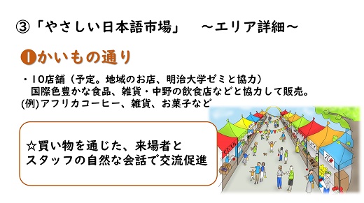 やさいちは、昨年度の東京都多文化共生プレゼンコンテストにて最優秀賞をいただいたプレゼンを原案とし、①買い物を通じた、来場者とスタッフの自然な会話で交流を促進する「かいもの通り」、②誰もが自由に文化を紹介・体験できる「じまん広場」、③会話を通じてお互いを知ることができる空間「おしゃべり喫茶」の3つのブースに分かれて行います。それぞれの場面で「やさしい日本語」を使っていただき、国籍などに関わらず気軽に交流できる機会を創出します。やさしい日本語とは、誰にとっても分かりやすいように、簡単な語彙や文法で、短くはっきりと話す日本語のことを指します。