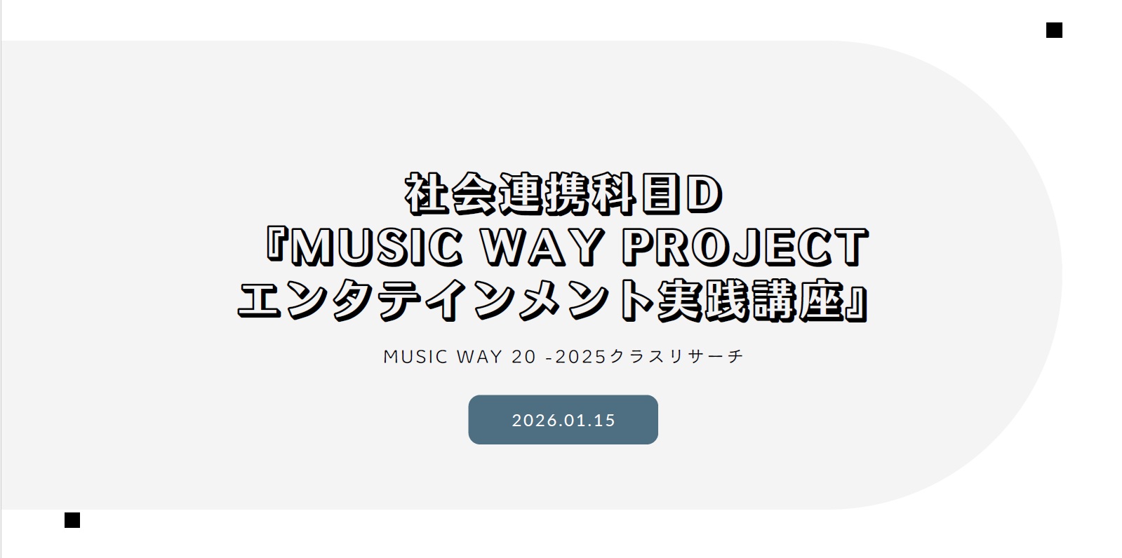 社会連携科目D「MUSIC WAY PROJECT エンタテインメント実践講座」は、エンタテインメント業界の第一線で活躍する多彩なゲスト講師を迎え、現在進行形の事象を体感しながら、学びを実践へとつなげることを目的とした科目です。「MUSIC WAY PROJECT」は、CEIPAおよびTOYOTA GROUPが展開する教育・人材支援プログラムの一環として実施されています。