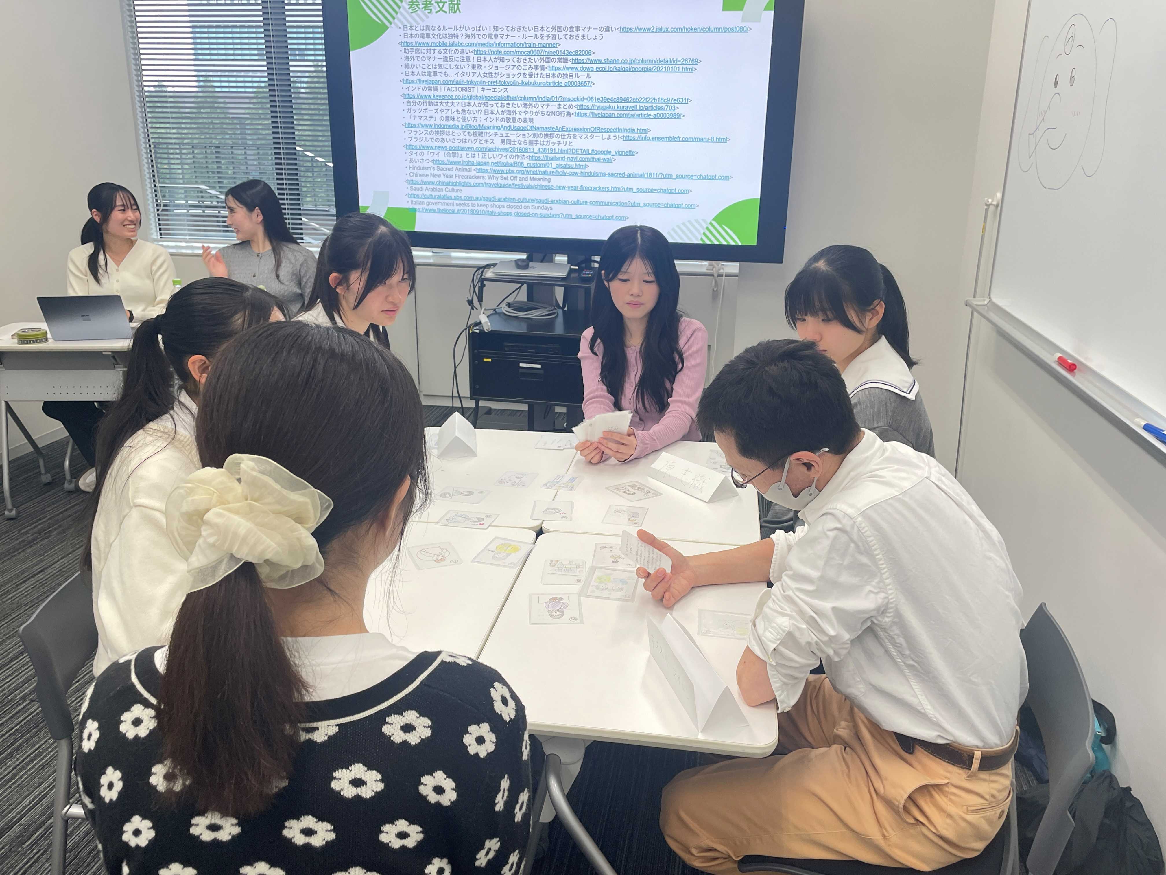 その後は、ゼミ生が独自に制作した「各国のマナーカードゲーム」をグループに分かれて実施しました。日本とは異なる文化や生活習慣を、かるた形式で楽しく学ぶことができるゲームです。ゲーム中はグループ内での交流が活発で、参加者一人ひとりが楽しみながら参加している様子が見られました。