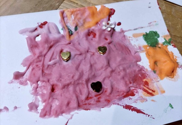 「ふわふわで、心にいつも寄り添ってくれる、自分だけの相棒を作ろう!」というテーマのもと、子どもたちはモコモコ絵の具に加え、ビーズやスパンコールを使いながら、想像をはるかに超える個性豊かな相棒を次々と生み出してくれました。
