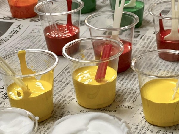 当日は、会場周辺地域の子どもたちが10名ほど参加してくれました。コップに入れたシェービングフォームに絵の具を少量垂らし、割り箸でかき混ぜて「もこもこ絵の具」を作るところから、子どもたちに楽しんでもらいました。
