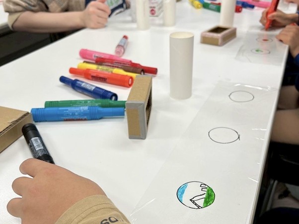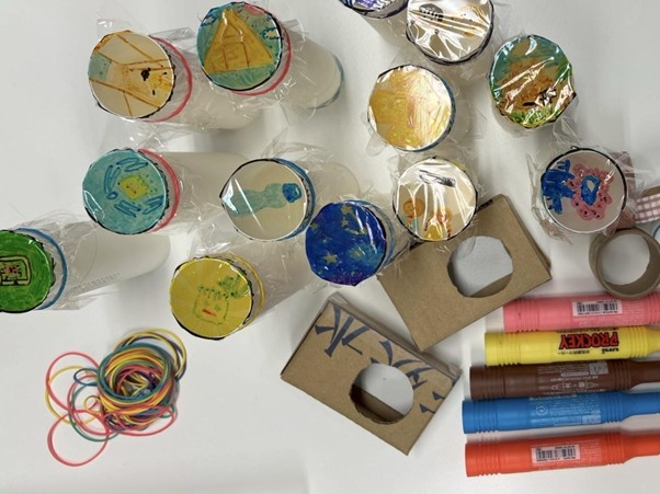 一つの「思い出」をテーマに、子どもたちは透明なフィルムに、その思い出にまつわるものをいくつか描きました。段ボールやトイレットペーパーの芯など、身近な素材を使ってデジタルカメラの形をしたスコープを制作し、光が通るように組み立てます。