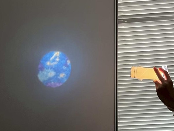 完成後は、フィルムに光を通して絵を壁に映し出し、「これはどんな思い出でしょう?」というクイズ形式で発表を行いました。ほかの子どもたちは、映し出されたヒントをもとに、何の思い出かを考えながら答えます。
