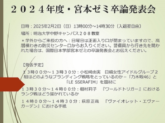 国際日本学部・宮本大人ゼミナールの卒論発表会を以下のスケジュールで行います。