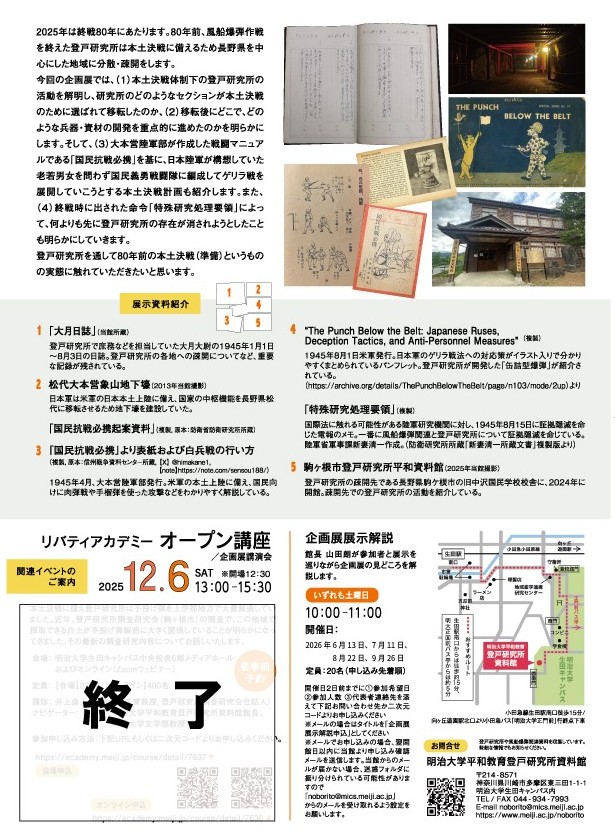 現在開催中の第16回企画展 「その時、わたしたちは戦うことを命じられた —登戸研究所と本土決戦体制—」はご好評につき2026年9月26日(土)まで会期を延長します。入場料無料。
