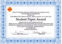 https://pvsec-27.com/)は、太陽電池の研究開発に関する国際会議として毎年開催されている著名な学会であり、本年は我が国の滋賀県、琵琶湖大津プリンストンホテルで、10か国以上から768件の論文が投稿され盛大に開催されました。受賞論文のタイトルは「Effects of carbon concentration on oxygen precipitation through annealing process in n-type Cz-silicon evaluated by IR light scattering tomography」です。本発表の内容は、本学が国立研究開発法人 新エネルギー・産業技術開発機構(NEDO)からの委託を受けて取り組んでいる、「高性能・高信頼性太陽光発電の発電コスト低減技術開発/太陽電池セル、モジュールの共通基盤技術開発/先端複合技術シリコン太陽電池プロセス共通基盤に関する研究開発(材料・プロセス評価基盤技術に関する研究開発)」の一環として、豊田工業大学と共同で取り組んだ成果の一部です。
