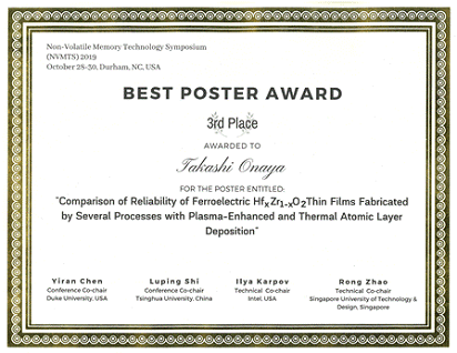受賞論文のタイトルは”Comparison of Reliability of Ferroelectric HfxZr1−xO2 Thin Films Fabricated by Several Processes with Plasma-Enhanced and Thermal Atomic Layer Deposition“です。