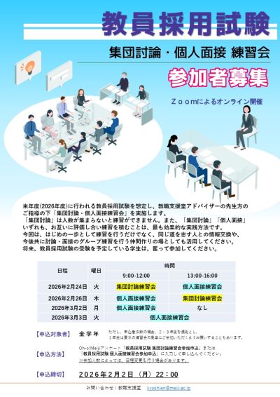 来年度(2026年度)に行われる教員採用試験を想定し、教職支援アドバイザーの先生方のご指導の下、「集団討論・個人面接練習会」をZoomによるオンラインで実施します。
