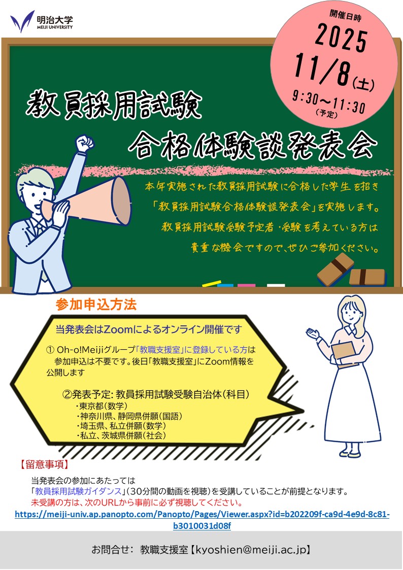後日、Oh-o!Meijiグループ「教職支援室」トピックにて、Zoom URLほか当日資料の案内をいたします。