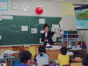 その次に、「お店で売っているものは、お店で作られていますか?」との問いから工場、問屋、お店という商品の流れについて教えました。さらに、商品には原価というものがあり、定価と原価の差のお金が、費用(給料・電気代など)と利益になることについて説明しました。