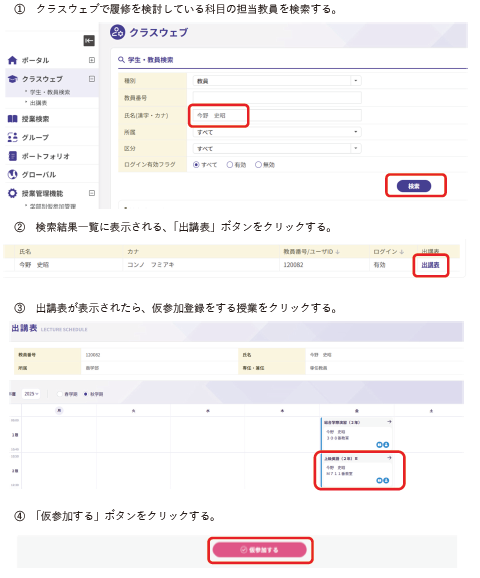 4.仮参加機能について(要注意:正規の履修登録ではない!)