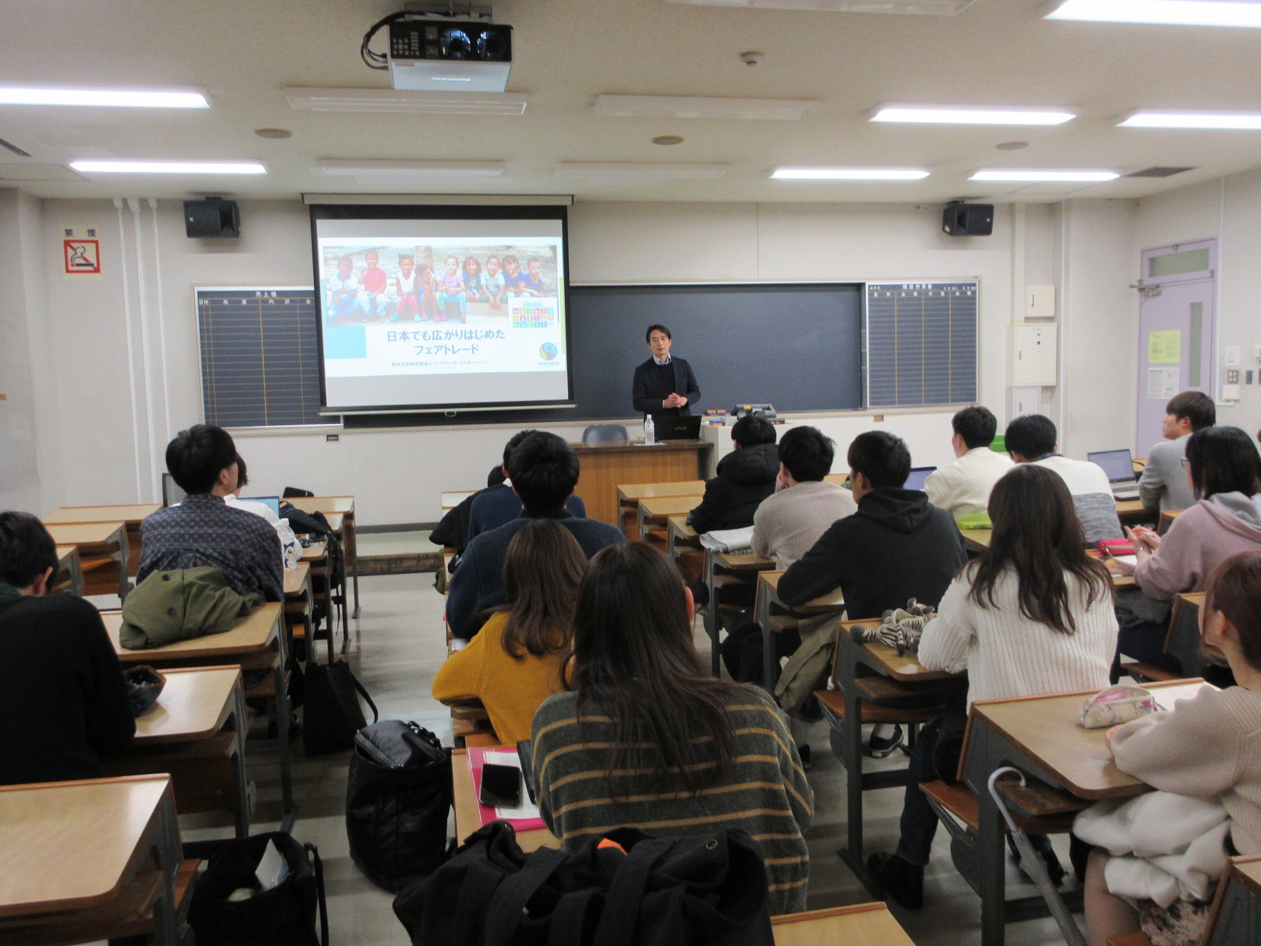 今回の特別授業は、国際フェアトレードラベル機構(Fairtrade International)の構成機関として日本国内における国際フェアトレード認証ラベルのライセンス事業、製品認証事業、そしてフェアトレードの教育啓発活動などを行っているフェアトレード・ラベル・ジャパンから、マーケティング・マネージャーの松井譲治さんをお招きし、「日本でも広がりはじめたフェアトレード」というテーマでご講義頂きました。