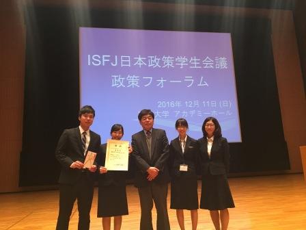 12月10日と11日の二日間、明治大学駿河台キャンパス他で開催された、日本政策学生会議主催の第21期ISFJ政策フォーラム(参加大学数23、参加ゼミ数50、提出論文数126本、参加総人数675名)において、千田ゼミナール環境班(商学部3年藤野眞子、中村颯、奥野希美、森恵実)の論文「世界遺産の環境保全政策-観光と保全の両立を目指して-」が上位5チームによる決勝プレゼンテーションに進出して、「優秀賞」を受賞しました。