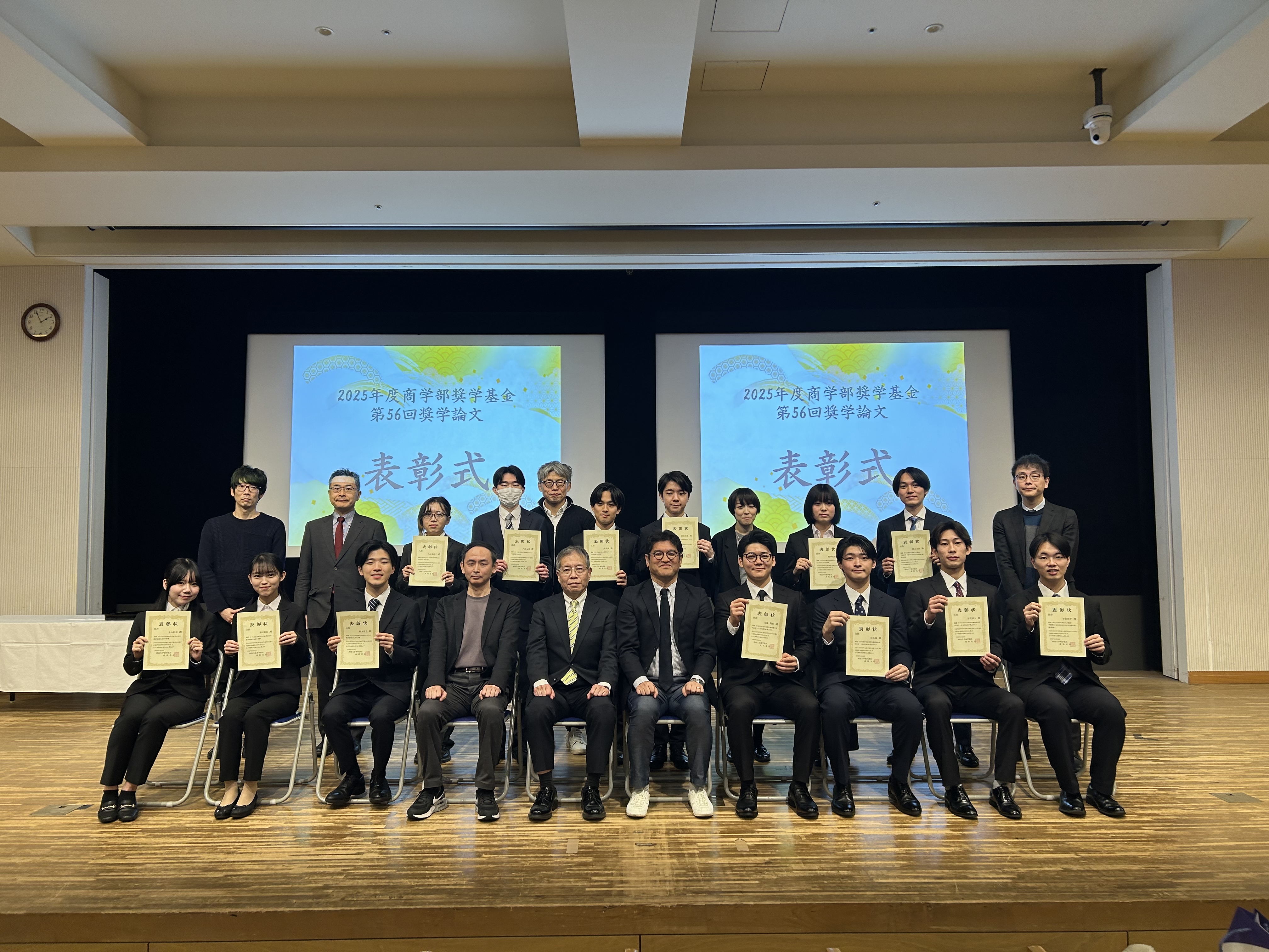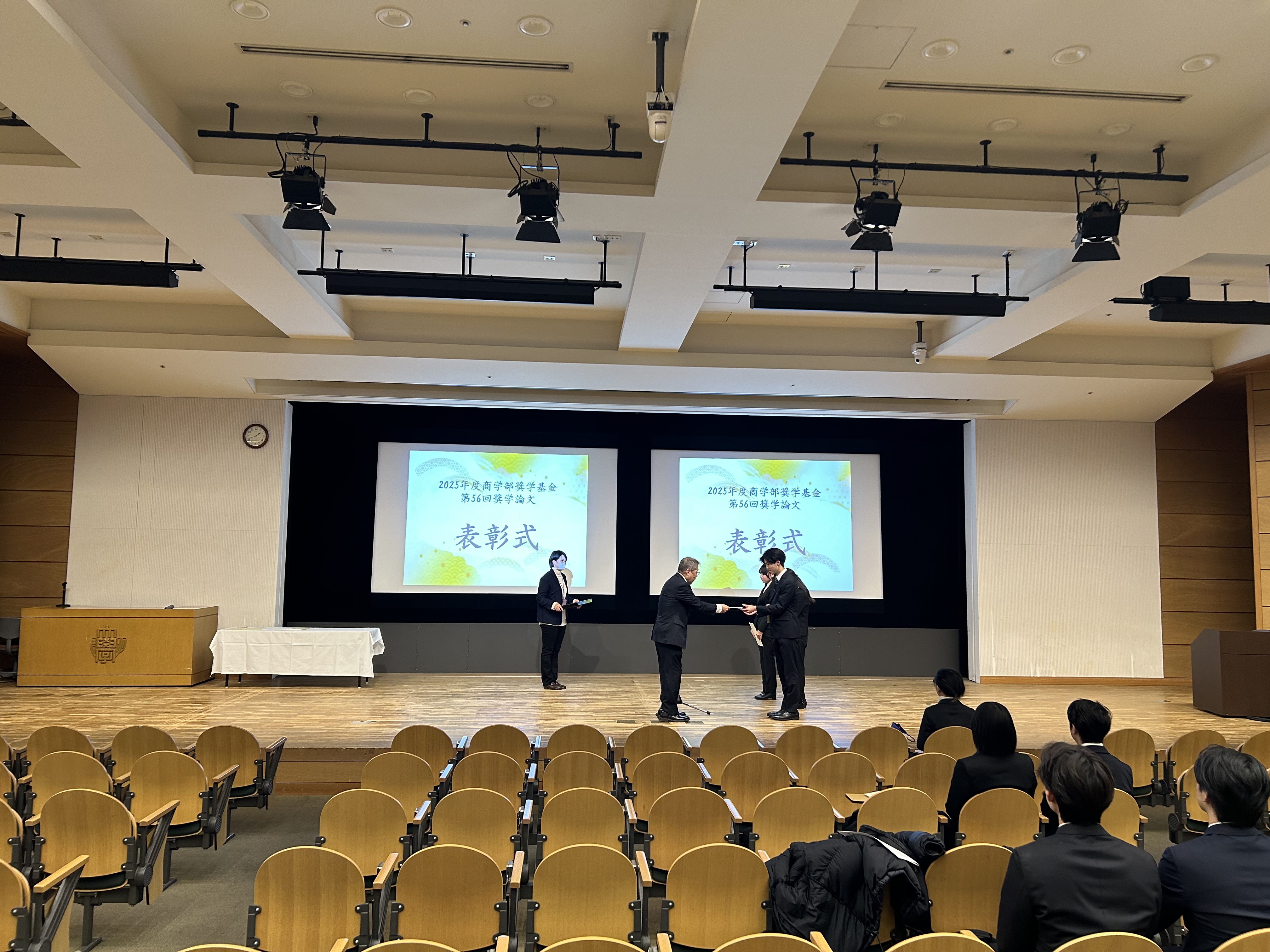 明治大学商学部では、篤志家の皆様のご厚意によりいただいた資金から、「商学部奨学基金」が作られています。この奨学基金をもとに、大学からの助成も加え、毎年1回、商学部学生を対象に、「奨学論文」を募集しています。応募された論文は、商学部教員で構成する奨学論文審査委員会において、厳正なる審査の上、入賞論文(特賞、入選、佳作)を決定し、表彰式が催されます。