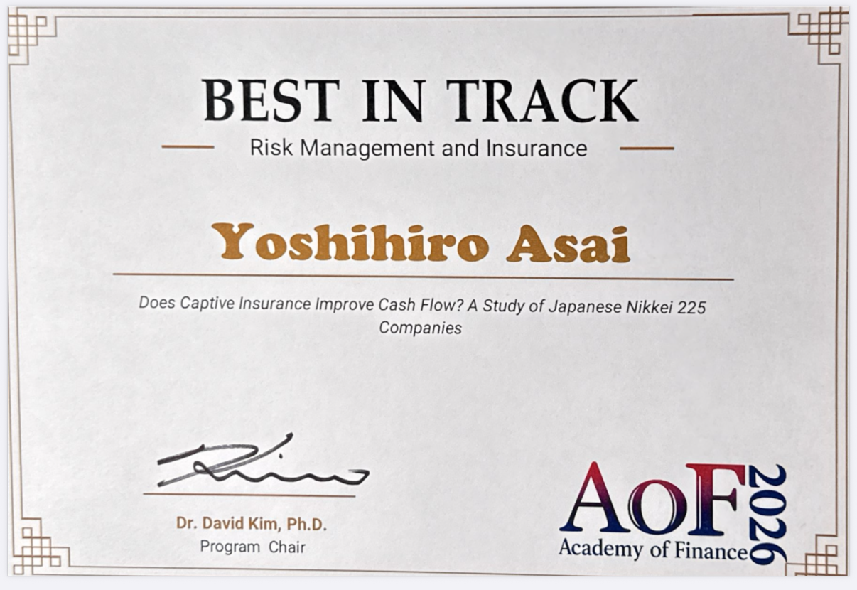 2026年3月26日に米国・シカゴで開催されたMidwest Business Administration Association第62回年次大会において、David Russell教授(California State University, Northridge)、Jiun-Lin Chen准教授(Valparaiso University)、Mu-Sheng Chang教授(California State University, Northridge)および本学商学部の浅井義裕教授による研究発表“Does Captive Insurance Improve Cash Flow? A Study of Japanese Nikkei 225 Companies” が、Best Paper Awardを受賞しました。