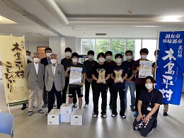 6月11日の納品日には、合宿所の学生のほか、調布市職員に加え、本学校友会東京都西部支部の役員が現地に立会い、お米約100kgとさらに校友会支部からのミネラルウォーターが引き渡されました。