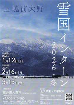 ◇概 要:福井県大野市は、福井県の東部に、そして全国の特別豪雪地帯の中でも南に位置し、自然が豊かで、周囲を山々に囲まれている盆地地形のまちです。市街地には天空の城として知られる越前大野城があり、その麓には城下町が広がっています。また、まちなかには、名水百選に選ばれた「御清水」などの湧水地が多く、水の都としても知られています。清らかな湧水や豊かな緑が広がる夏の大野で、地域ならではの祭りや仕事を通じて、まちづくりの現場や都市部にはない「雪国の冬の暮らし」と出会ってみませんか。