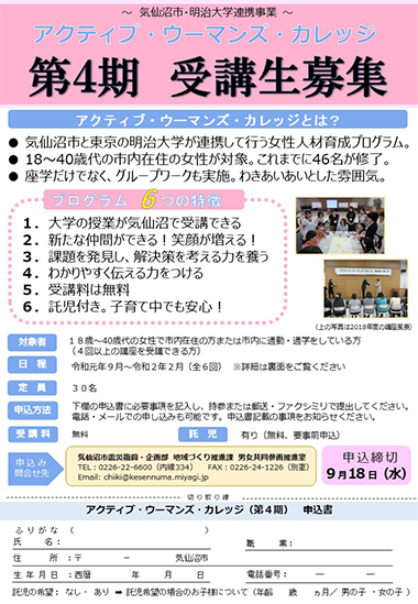 気仙沼市では、「市民が主役のまちづくり」をスローガンに掲げ、復興計画の一つとして、これからの地域づくりを担う人材育成に積極的に取り組んでいます。 この人材育成事業のうち、明治大学では、女性活躍を一層推進するための公開講座「アクティブ・ウーマンズ・カレッジ」を企画・市と共催してきました(2017~2019)。 本講座では、市民が自分たちの言葉や感性を生かして地域の魅力を発信することを目的に、これまで「フォトブック」や「フライヤー」の制作のほか、住民主体の街づくりについて学ぶ連続講座を開講してきました。