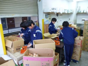 入船中学校から来た4名の生徒は、午前中にサポートマルシェにおいて東北被災地の商品の販売、午後にはスーパーの野菜部門で野菜の仕分けや袋詰めを行いました。