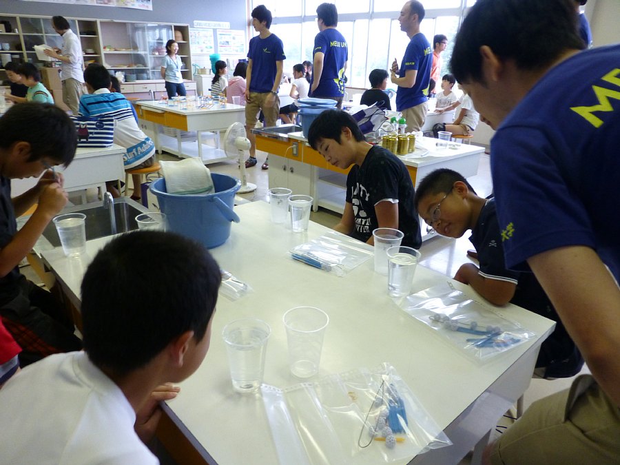 「ものづくりを通して子供たちの科学技術への興味を喚起する」ことを目的に、1995 年度から理工学部が行っている夏休み科学教室の一部を、今回は「明大Week in 新地」期間中に、出張形式で実施しました。本学からは指導教員として土屋一雄(理工学部・教授)、矢崎成俊(理工学部・准教授)の2 名のほか、ボランティア7 名(学部4 年生6 名、一般1 名)、また、今年は福島大学からのボランティア3名(笠井博則准教授、学部4年生2名)にもご協力いただき、計12 名で実施しました。