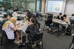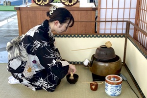 【地域連携】 茶華道研究部は、ジャパンオープンテニスの会場で越前漆器を使った抹茶体験を実施しました。本学の創立者の一人・矢代操が鯖江市出身というご縁からPRイベントのお手伝いをしました。3日間にわたり、大会関係者を中心に約100人の方々に越前漆器の抹茶碗や銘々皿で抹茶を楽しんでいただきました。外国人の方も多く、日本文化の魅力を直接お伝えできる貴重な機会となりました。茶会関係のお手伝いをすることは普段からあるのですが、「茶道を通じて地域産業の魅力を伝える」ということは初めての機会でした。越前漆器の上品な質感と茶道の持つ国際的な魅力を再認識しました。