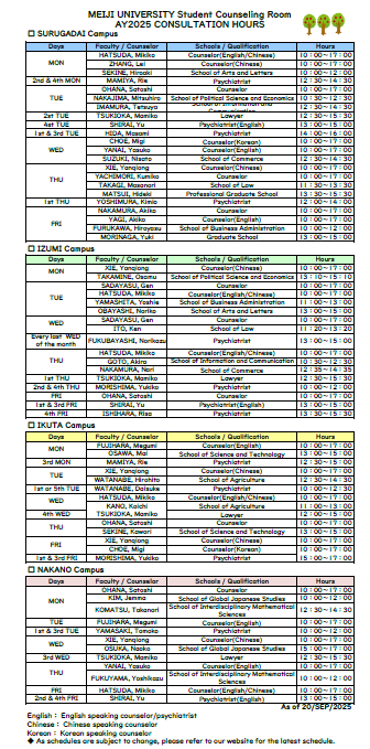 * All counseling is available for registered Meiji university students and family / faculty / staff seeking consultation concerning registered Meiji university students.