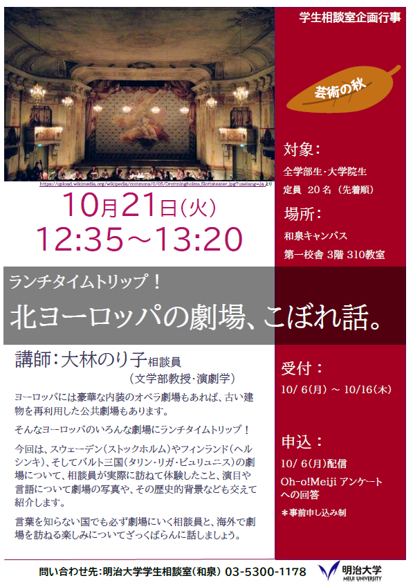 このたび、学生相談室では対面行事「ランチタイムトリップ! 北ヨーロッパの劇場、こぼれ話。」を実施します。