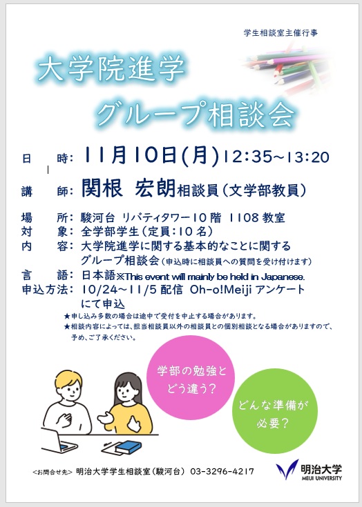 このたび、学生相談室では対面行事「大学院進学グループ相談会」を実施します。