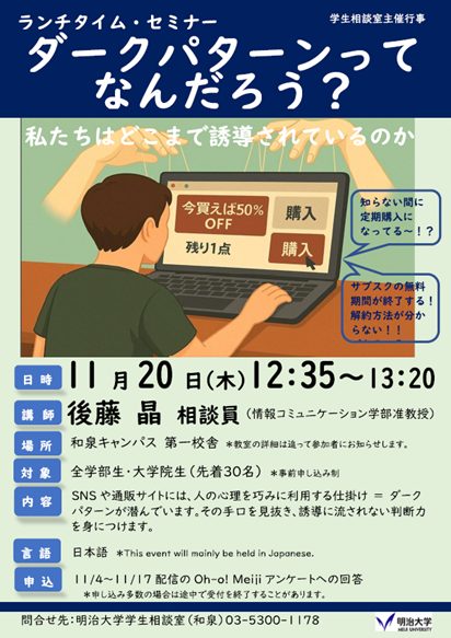 学生相談室では対面行事「ダークパターンってなんだろう?私たちはどこまで誘導されているのか」を実施します。