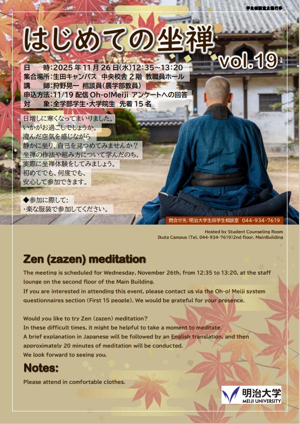 A brief explanation in Japanese will be followed by an English translation, and then approximately 20 minutes of meditation will be conducted.