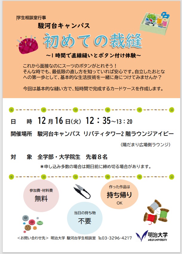 このたび、学生相談室では、自立したおとなへの第一歩として基本的な生活技術を身につけることを目的に「初めての裁縫~1時間で直線縫いとボタン付け体験~」を開催します。
