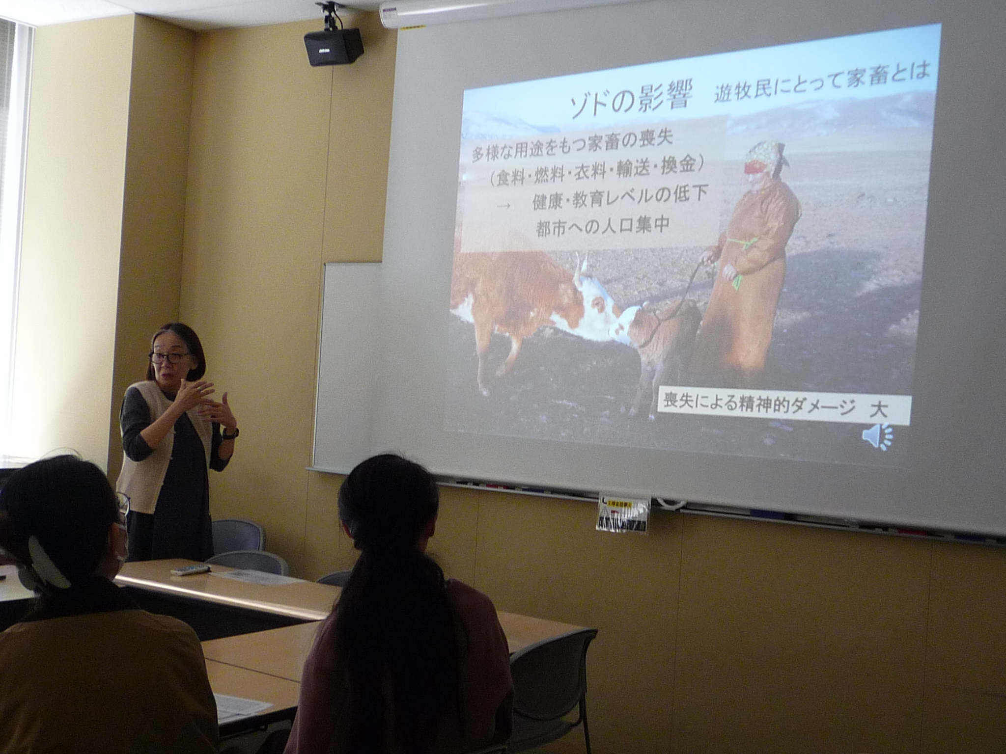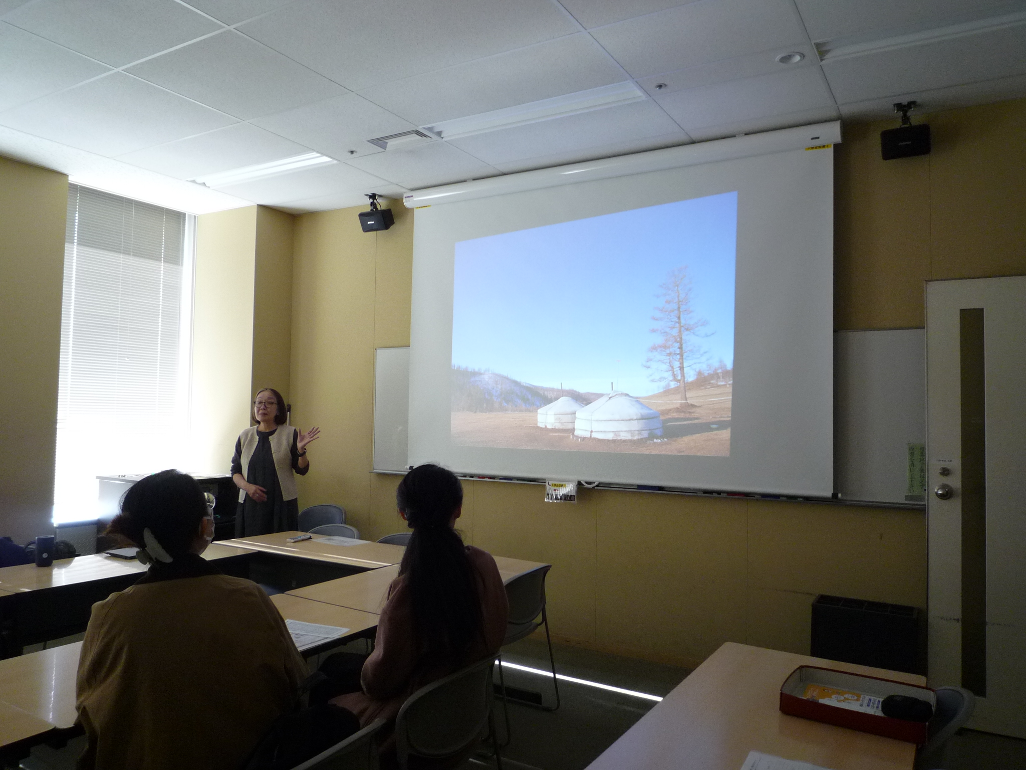 森永由紀先生(商学部教授、大学院教員相談員)より、先生がこれまで実際に訪れたモンゴル高原の遊牧民の暮らしについて、撮影した写真のスライドやデータ等を見ながらお話を伺いました。モンゴルや遊牧民に興味のある学生などが参加し、熱心に話を聞いていました。