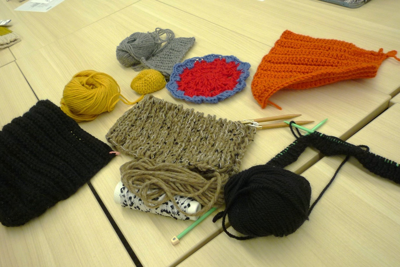ビギナーの参加者は、かぎ針編みでコースターやシュシュ作りに挑戦したり、基本の編み方を繰り返し練習したりと、それぞれのペースで編み物を楽しみました。一方、経験者は製作途中の手袋や帽子、セーターなどを持ち寄り、互いに作品を眺めながら、談笑しつつ思い思いに制作。教員も“編み物好き”として学生と同じ輪に加わり、和気あいあいと手を動かします。