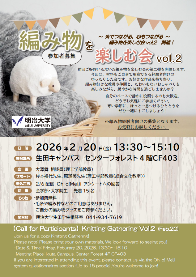 If you are interested in attending this event, please contact us via the Oh-o! Meiji system questionnaires section (Up to 15 people).