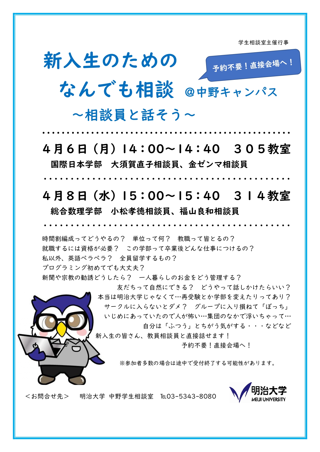学生相談室では、国際日本学部と総合数理学部の新入生の学生生活の充実のため、「新入生のためのなんでも相談@中野キャンパス~相談員と話そう~」を開催します。