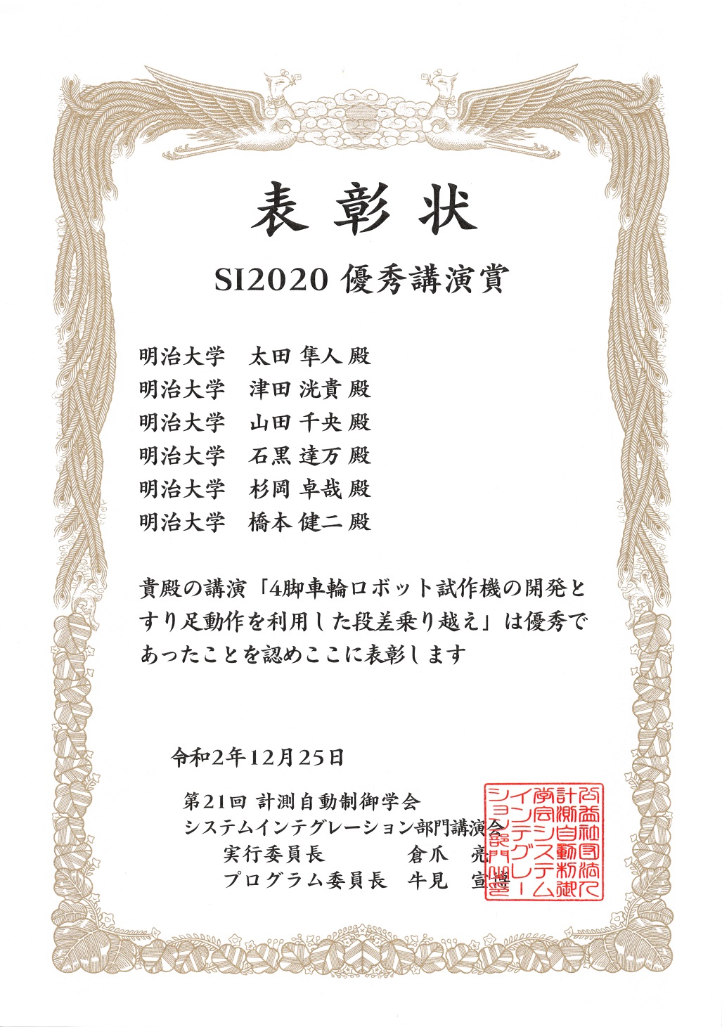2020年12月に開催された第21回計測自動制御学会システムインテグレーション部門講演会(SI2020)(オンライン開催)において、理工学研究科機械工学専攻知能ロボティクス研究室