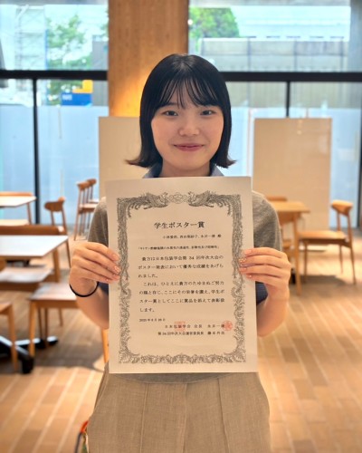 理工学研究科応用化学専攻博士前期課程2年の小林愛莉(こばやし あいり)さん(永井一清研究室)が、東京海洋大学越中島キャンパスで2025年8月28日~29日に開催された日本包装学会第34回年次大会にて学生ポスター賞を受賞しました。発表題目は「キトサン酢酸塩膜の水蒸気の透過性、溶解性及び拡散性」であり、国内外からよせられた対象論文の中から選ばれました。