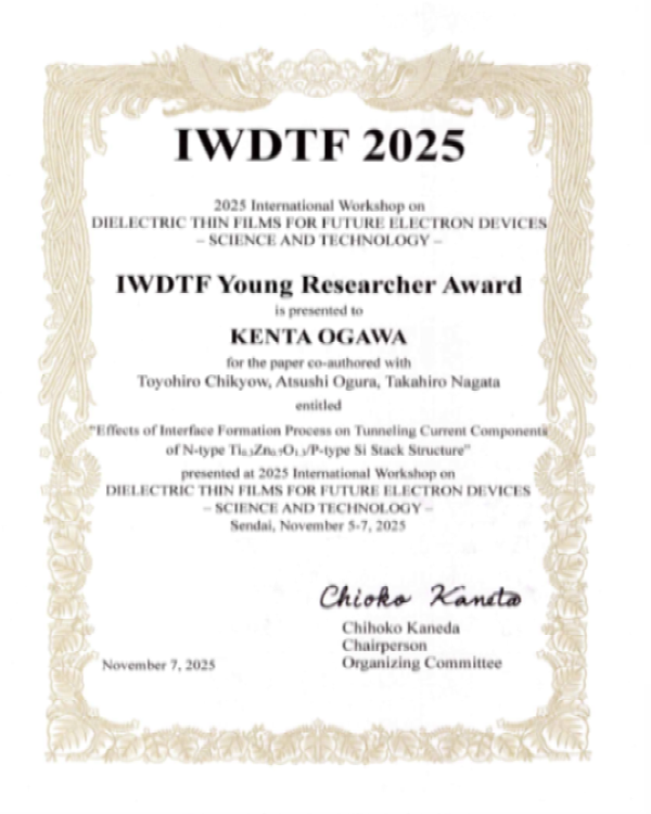 理工学研究科 電気工学専攻 博士前期課程2年 小川健太さん( 半導体ナノテクノロジー研究室 指導教員:小椋厚志教授)が、The 2025 International Workshop on “Dielectric Thin Films for Future Electron Devices: Science and Technology” (IWDTF2025)でYoung Researcher Awardを受賞しました。