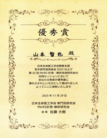 電気工学専攻 博士前期課程2年の山本智也さん(健康医工学研究室・小野弓絵専任教授)が、日本生体医工学会専門別研究会・第35回 fNIRS 計測・解析技術研究会(2025年11月29日、明治大学生田キャンパス、日本生体医工学会関東支部若手研究者発表会2025との同時開催)において、優秀発表賞を受賞しました。