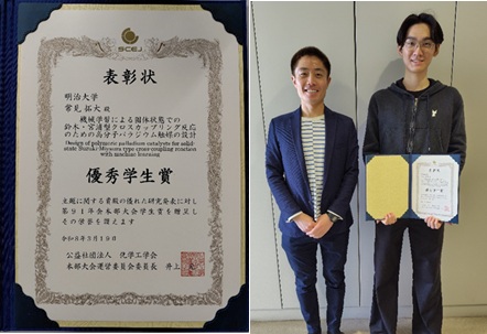 理工学研究科応用化学専攻博士前期課程1年の常見拓大さん(金子弘昌研究室)が、京都大学吉田キャンパスで開催された化学工学会第91年会において、優秀学生賞を受賞しました。