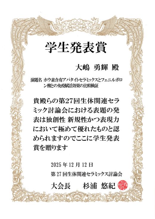 上記の研究結果が認められ、12月12日に香川県の高松商工会議所にて開催された第27回生体関連セラミックス討論会にて、「学生発表賞」を授与されました(対象発表17件中3件が受賞)。本学会は、生体関連材料に関するサイエンスとテクノロジーに関する研究発表形式の討論会であり、今回で27回目の開催となります。なお、明治大学生命機能マテリアル国際インスティテュートの一環として実施されました。