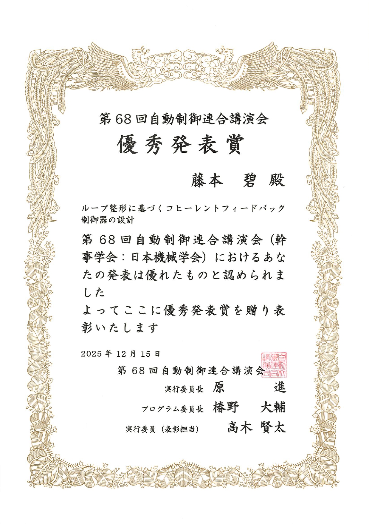 第68回自動制御連合講演会で優秀発表賞を受賞しました。