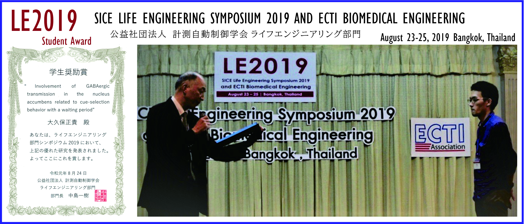 理工学研究科電気工学専攻博士前期課程1年 大久保正貴さん(脳回路機能研究室、指導教員:梶原利一専任准教授)が、LIFE ENGINEERING SYMPOSIUM 2019(LE2019)にて、学生奨励賞を受賞しました。