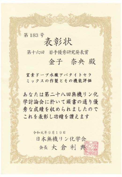 上記の研究成果が認められ、9月19日・20日に山梨大学で開催された「第28回無機リン化学討論会」において、相澤研究室所属の金子奈央さんが若手優秀研究発表賞を受賞しました(対象者17名中3名が受賞)。なお、日本無機リン化学会はリンを含有する無機物質およびそれに関係する物質に特化した学会であり、無機リン化学討論会は今回で28回目を数えます。なお、この研究は明治大学「生命機能マテリアル研究クラスター」の一環として実施されました。