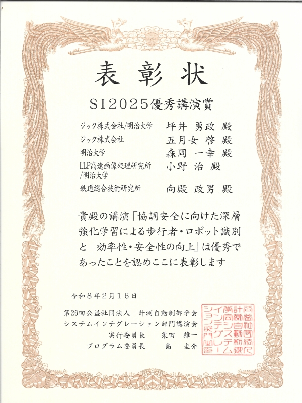 小野治名誉教授(理工学部電気電子生命学科)・向殿政男名誉教授(理工学部情報科学科)らが第26回計測自動制御学会 システムインテグレーション部門講演会(SI2025)で優秀講演賞を受賞しました。 講演タイトル:「協調安全に向けた深層強化学習による歩行者・ロボット識別と 効率性・安全性の向上」 受賞者:小野 治 名誉教授、向殿 政男 名誉教授、森岡 一幸 総合数理学部専任教授、坪井 勇政 理工学部兼任講師、五月女 啓(明治大学総合数理学部卒)
