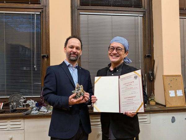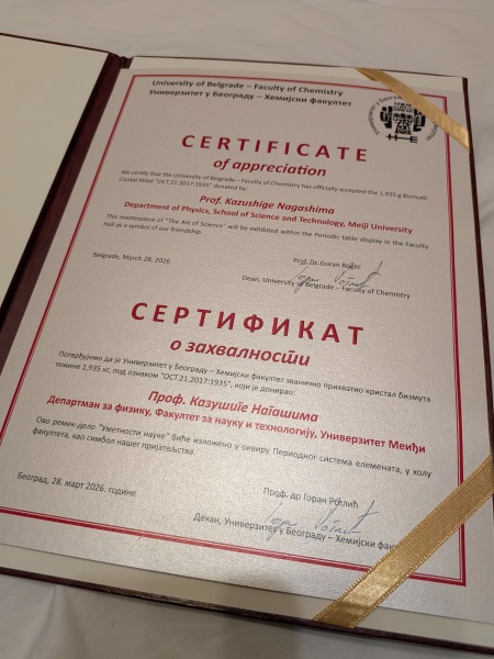 2026年3月28日長島和茂教授が制作した大型ビスマス人工結晶(作品名:OCT.21.2017:1935、重量:1,935g)が、ベオグラード大学化学部に寄贈されました。 これに伴い、同学部より感謝状が授与されました。 この結晶は、同大学が推進する「周期表展示(Periodic Table display)」の貴重なコレクションとして、今後、化学部内に展示される予定です。