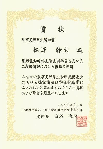 2026年3月7日に開催された第31回 電子情報通信学会東京支部学生会研究発表会において、理工学部 電気電子生命学科 電気電子工学専攻4年の松澤幹太さん(村上研究室)が「線形能動的外乱除去制御器を用いた二段階制御における振動の抑制」(共著者:同学科名誉教授 石田義久・同学科専任准教授 村上隆啓)と題した研究発表を行い、東京支部学生奨励賞を受賞しました。