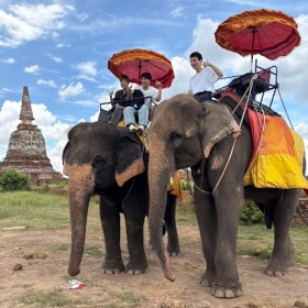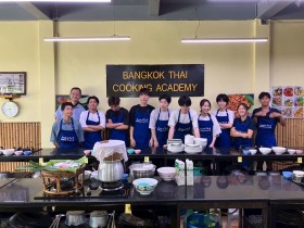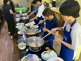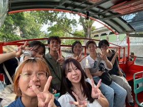 シーナカリンウィロート大学(SWU)人文学部日本語学科の学生との交流プログラムとして、「バンコク市内一日ツアー」を実施しました。事前にオンラインで顔合わせを行っていたこともあり、合流後すぐに打ち解けることができました。ツアーでは、著名な寺院などの観光地だけでなく、現地学生が日常的に利用している施設、特に大型のショッピングモールや町の飲食店を訪れ、文化的背景や生活習慣について直接学ぶ機会となりました。